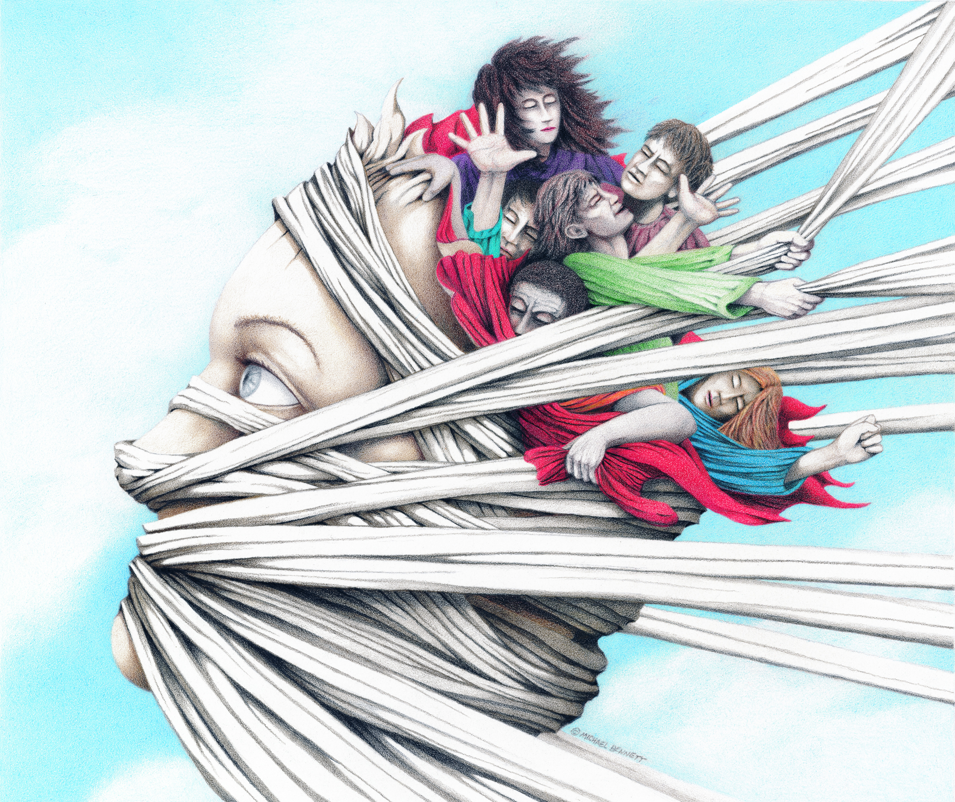 Beginning with illustration work for magazines, posters, calendars and books, a shift in direction led Michael to essentially abandon painting and drawing for almost 15 years. In the mid 1990s, Ken Golden of The Laser’s Edge Group saw Michael’s previous work and asked him to create the art for Il Trono Dei Ricordi’s self-titled release. Since then, Michael has established an international reputation as an artist for his surrealistic and expressionistic work, particularly within the music industry. You may have seen his paintings on releases by Wobbler, Cast, A Triggering Myth, Nathan Mahl, Ethos, Ozone Quartet, and many others, his masthead for Progression Magazine, or his art for events like ProgDay and Cruise To The Edge.